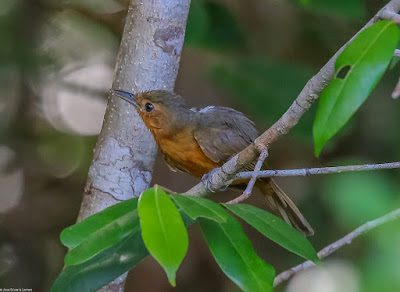 Esse ai, cor pardinho ou chocolatinho, é a fêmea do Formigueiro de cauda curta, Myrmelastes humaythae, uma ave que vive embrenhada no escurinho da floresta. Para fotografa-la, tivemos de adotar uma postura espartana: nada de movimento ou barulho. O que foi difícil com uma multidão de pernilongos famintos nos atacando.